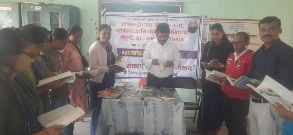 दिनांक 16 /01/2025 गुरुवार रोजी सकाळी 10.30 वाजता ग्रंथ परिक्षण आणि निबंध कथन कार्यक्रम आयोजित करण्यात येऊन लेखक आणि वाचक यांनी पुस्तक वाचन कथन आणि परीक्षण करून उत्कृष्ट निबंधाची निवड करण्यात आली त्यामध्ये प्रथम, द्वितीय आणि तृतीय तसेच तिन प्रोत्साहन पर निबंधाची निवड करण्यात आली. यावेळी कार्यक्रम अध्यक्ष म्हणून उपप्राचार्य डॉ. श्याम साळुंखे उपस्थित होते. तसेच सर्व समितीतील सदस्य , सर्व प्राध्यापक वृंद, शिक्षकेतर कर्मचारी, विद्यार्थी, विद्यार्थिनी जास्तीत जास्त संखेने उपस्थित होते .